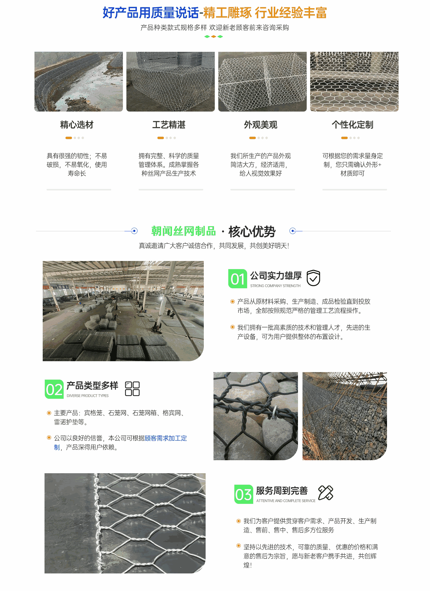 深州市朝聞絲網(wǎng)制品有限公司擁有“中國絲網(wǎng)之鄉(xiāng)”美譽的河北省致力于生產(chǎn)銷售格賓網(wǎng),雷諾護(hù)墊,景觀石籠網(wǎng),邊坡防護(hù)網(wǎng),綠濱墊,固濱籠的廠家,規(guī)格多種多樣。 我廠堅持技術(shù)創(chuàng)新、科學(xué)管理、誠信經(jīng)營,注重引進(jìn)新型生產(chǎn)技術(shù)設(shè)備,推行標(biāo)準(zhǔn)化生產(chǎn),采用質(zhì)量管理體系,從原材料采購、生產(chǎn)管理、產(chǎn)品檢測等關(guān)鍵環(huán)節(jié)嚴(yán)格把關(guān),確保了產(chǎn)品質(zhì)量,贏得了客戶的信賴。我公司秉承“誠信、務(wù)實、高效”的企業(yè)宗旨,真誠希望與世界各地客戶互惠互利,共創(chuàng)美好未來!多年來"以誠立廠","以質(zhì)興業(yè)"。 憑借過硬的質(zhì)量、良好的信譽、優(yōu)質(zhì)的服務(wù)、合理的價格不斷拓展市場,誠摯的希望在平等互利,坦誠相待的基礎(chǔ)上與國內(nèi)外客戶長期合作!...